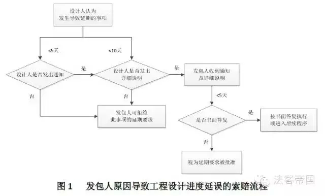 如果发包人在收到设计人提交要求延期的详细说明后,在约定的期限内未予答复,则视为设计人要求的延期已被发包人批准。如果设计人未能按本款约定的时间内发出要求延期的通知并提交详细资料,则发包人可拒绝作出任何延期的决定”。流程如图1所示。