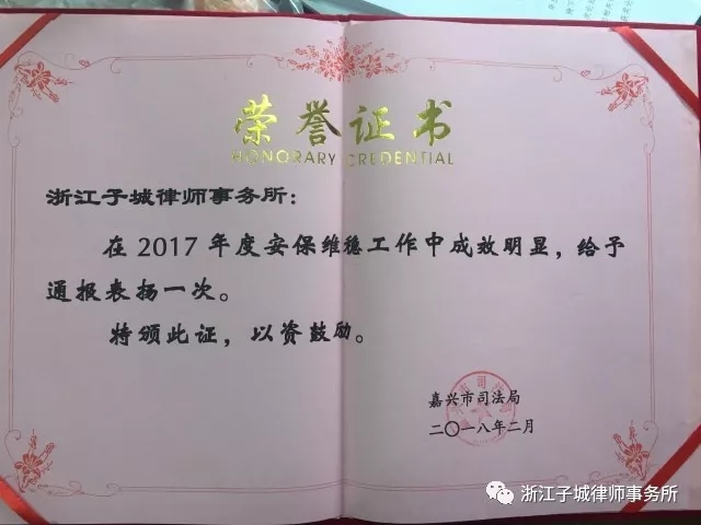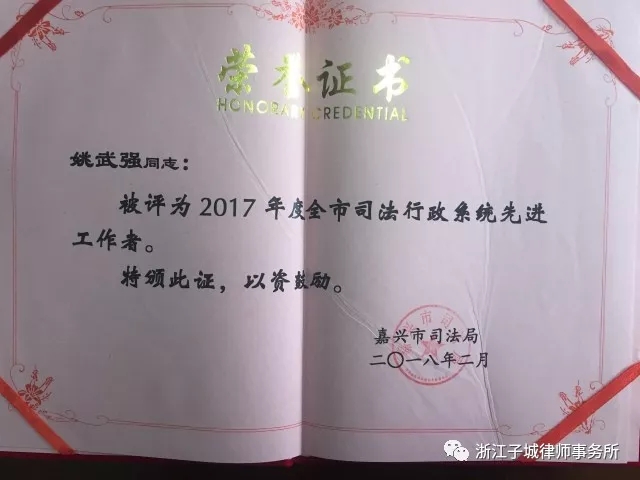 3月6日下午,我市召开全市司法行政工作会议,嘉兴市司法局党委书记、局长周梅芳出席会议并作重要讲话。会上表彰了2017年全市司法行政系统先进集体及先进工作者。本所继去年获评全市司法行政系统先进集体和嘉兴市“五星级律师事务所”复评第一名后,我所主任、高级律师姚武强又获评“2017年度全市司法行政系统先进工作者”荣誉称号。本所也应2017年度在全市安保维翁工作的突出表现,获嘉兴市司法局给予通报表扬一次。