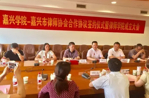 会上嘉兴学院与嘉兴市律师协会共同签署了《嘉兴学院与嘉兴市律师协会全面合作框架协议》并为“嘉兴学院律师学院”揭牌;嘉兴学院为浙江子城律师事务所等15家“嘉兴学院校外实践实训基地”授牌、聘请姚武强、何鑫芳等22名律师为“嘉兴学院兼职教师”;市律师协会聘请嘉兴学院欧阳仁根等5名专家学者为学术顾问。